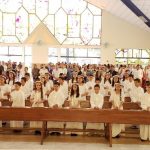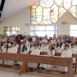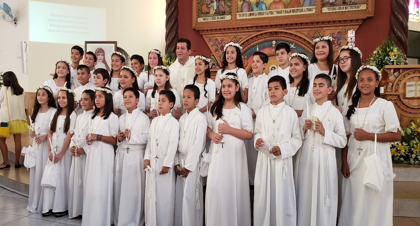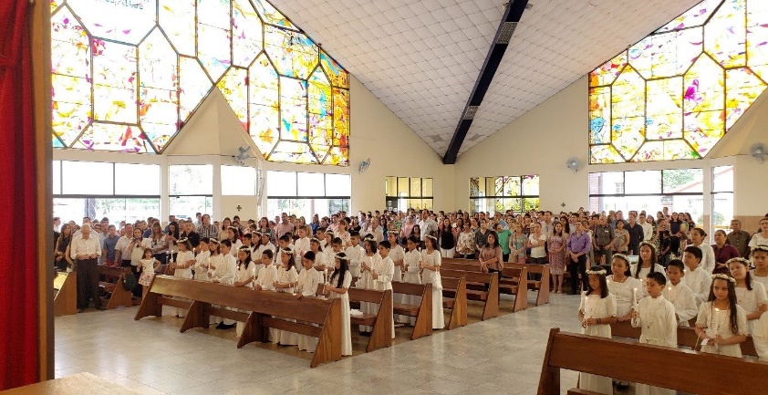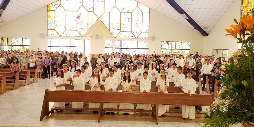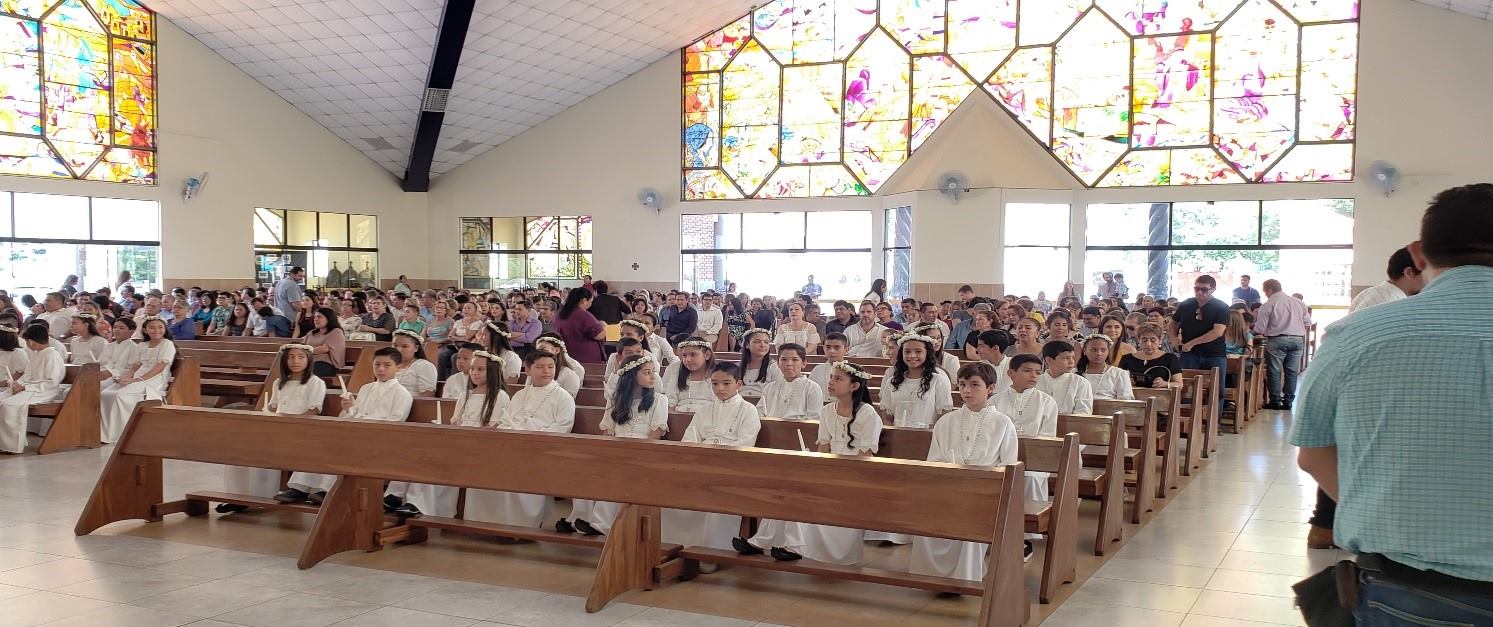 Toda la comunidad Domingo Savio reunido en torno al altar acompañamos a nuestros alumnos que recibieron a Jesús por primera vez, después de haber recorrido un camino en compañía de su familia profesores en el conocimiento de Jesús.