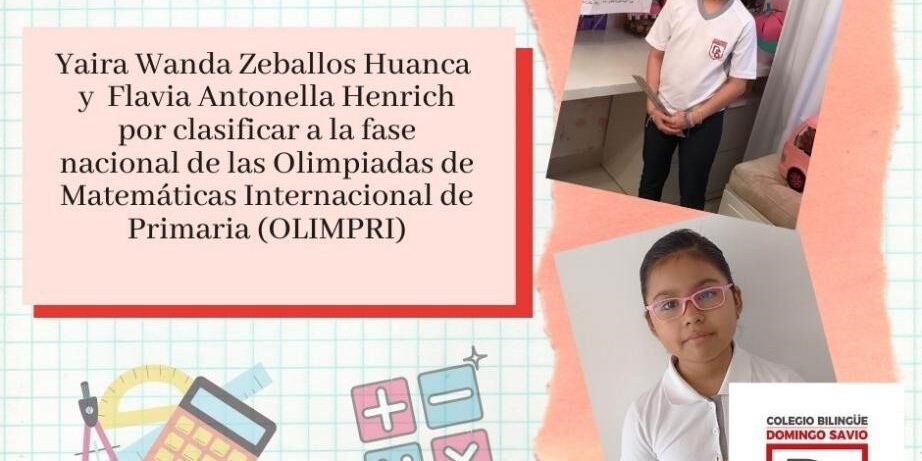 Felicitamos a las estudiantes Yaira Wanda Zeballos Huanca (P4) y Flavia Antonella Henrich (P6) por clasificar a la fase nacional de las Olimpiadas de Matemáticas Internacional de Primaria (OLIMPRI).